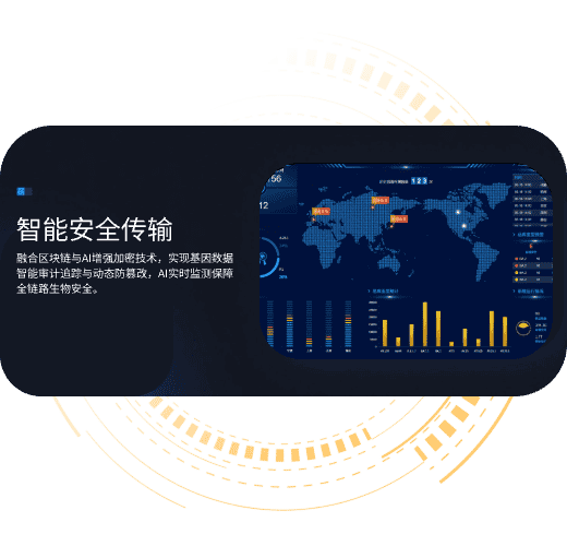 融合区块链与AI增强加密技术,实现基因数据智能审计追踪与动态防篡改,AI实时监测保障全链路生物安全。